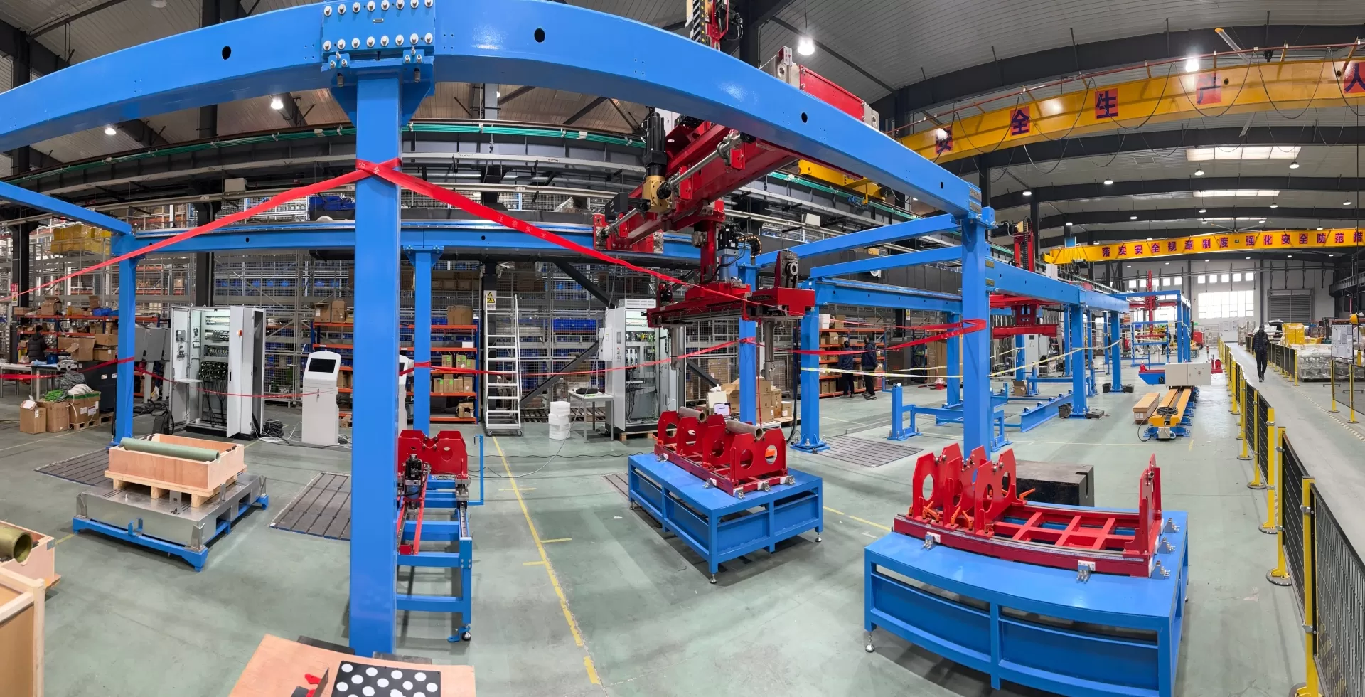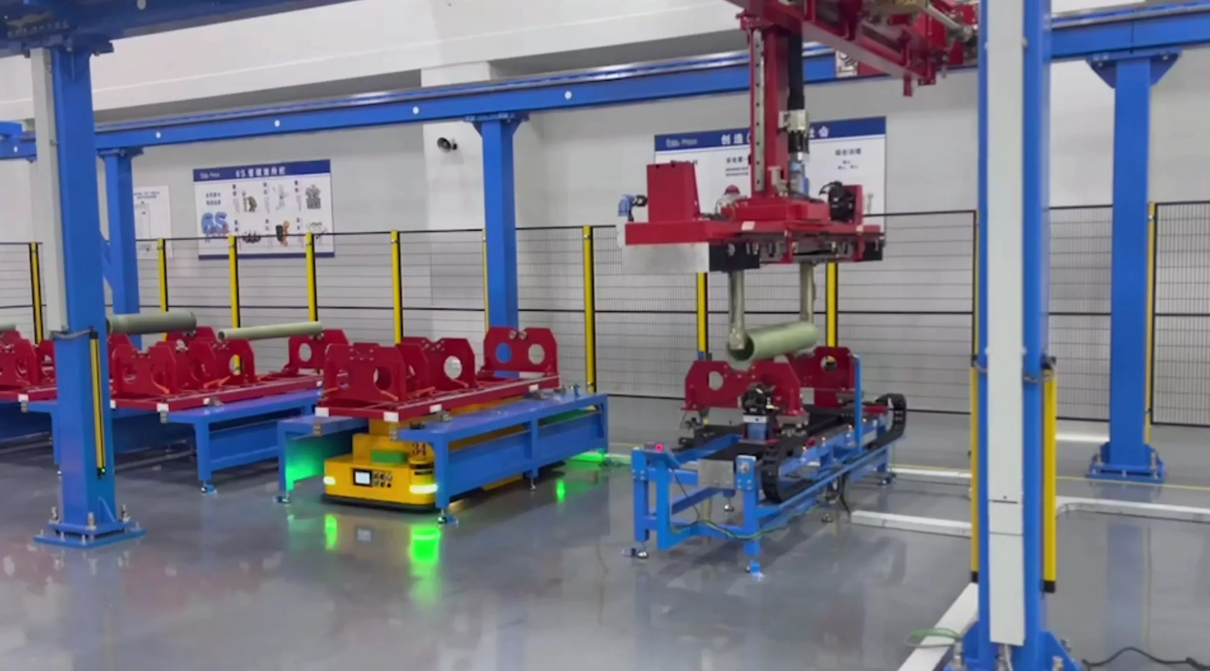 全流程、多负载项目通过重载桁架机器人、定制AGV、信息化系统等的融合应用,实现铜箔从生箔、烘烤、分切、气涨轴穿拔轴、检测、包装、装箱全流程的万级洁净环境的自动化生产过程。