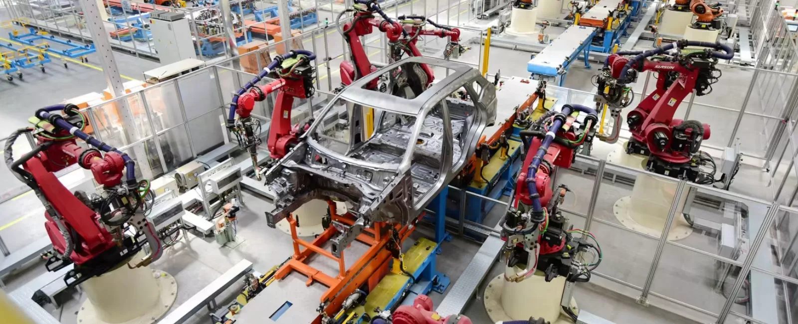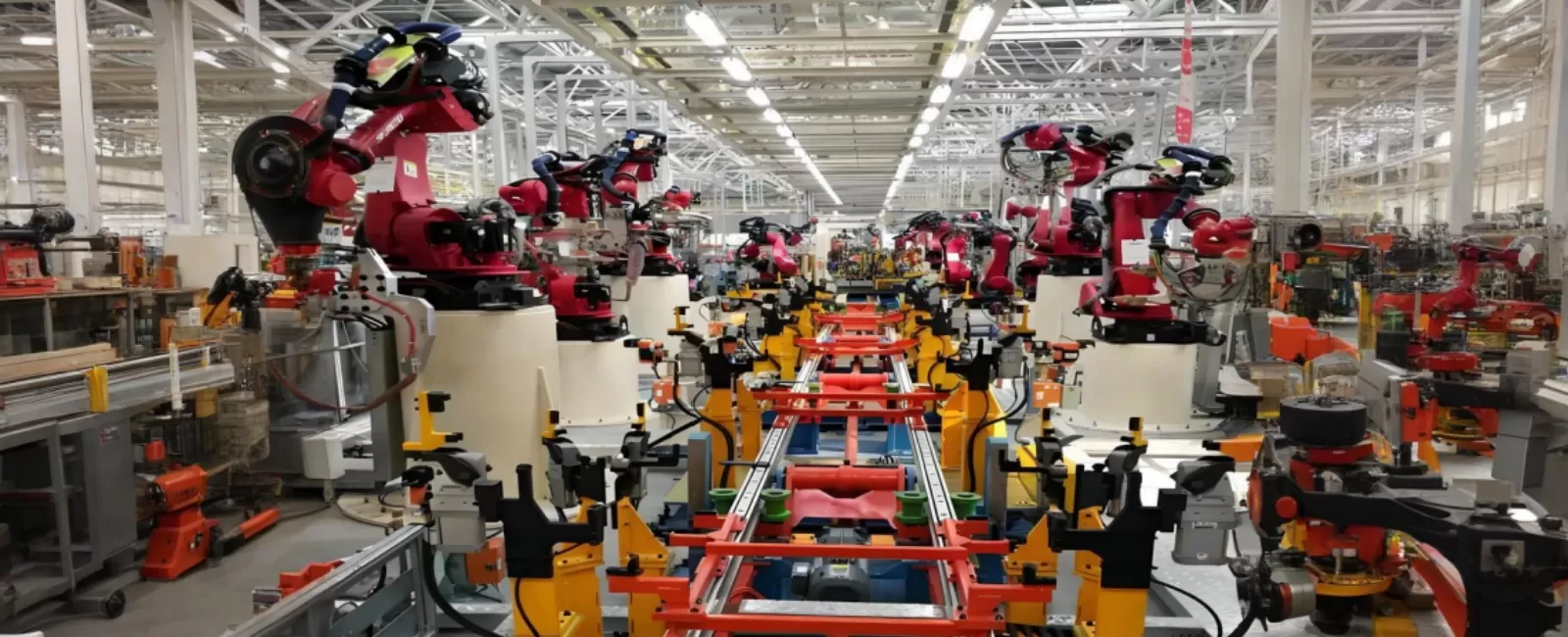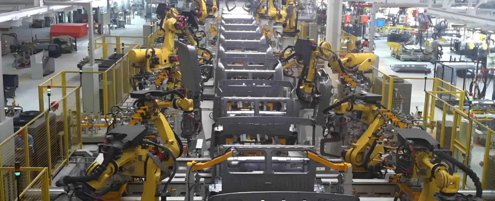 车型自由切换汽车白车身焊接线,包含发舱焊接线、纵梁焊接线、侧围焊接线、底板焊接线和主焊线,采用往复杆、滚床滑橇等输送方式,关键工位采用标准化柔性生产,可以实现4种车型自由切换。整线机器人数量超过100台,总拼工位采用十字滑台柔性切换,辊床输送、不占非工艺节拍,设备利用率高。