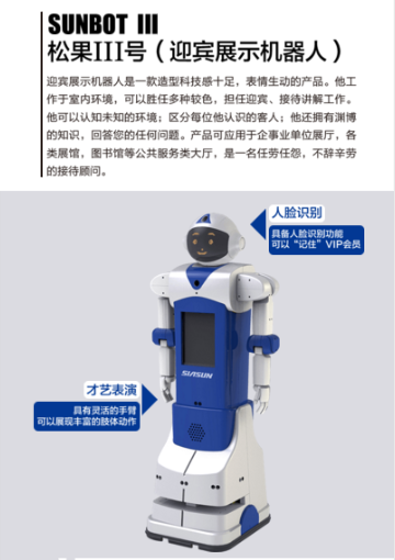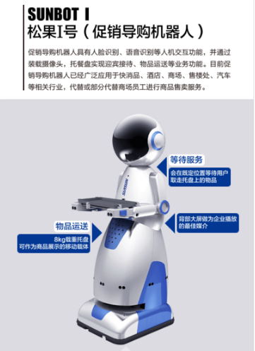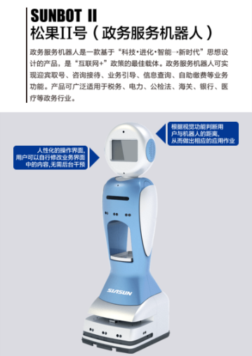 如今,服务机器人正大量进入人们的生活,将成为人类的好帮手。除公共服务机器人“松果”系列之外,蓝狮娱乐公司还将推出医疗机器人“松康”系列,陪护型机器人“松友”系列,教育机器人“松宝”系列产品。