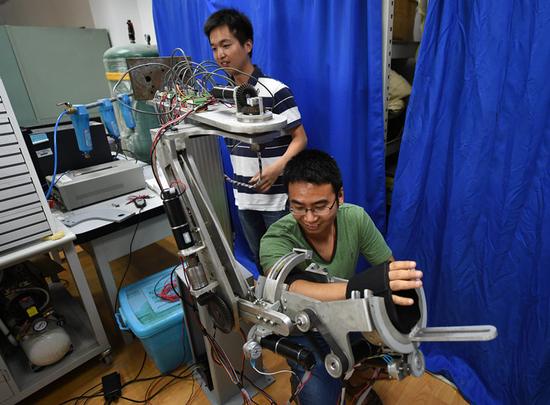 深圳自动化所科研人员在测试一款研制阶段的医疗手术机器人(2015年7月30日摄)。新华社记者 姚剑锋 摄