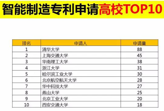 智能制造专利申请最多的高校是清华大学(88),其次是上海交通大学(45),华南理工大学(38)。
